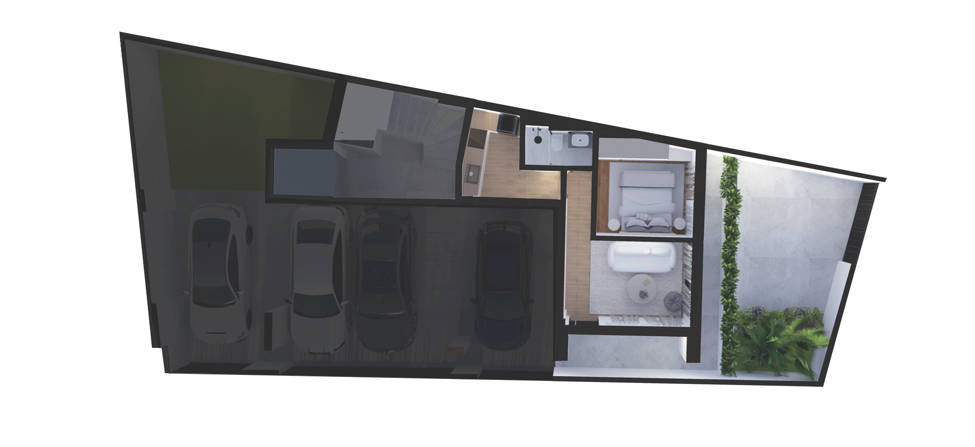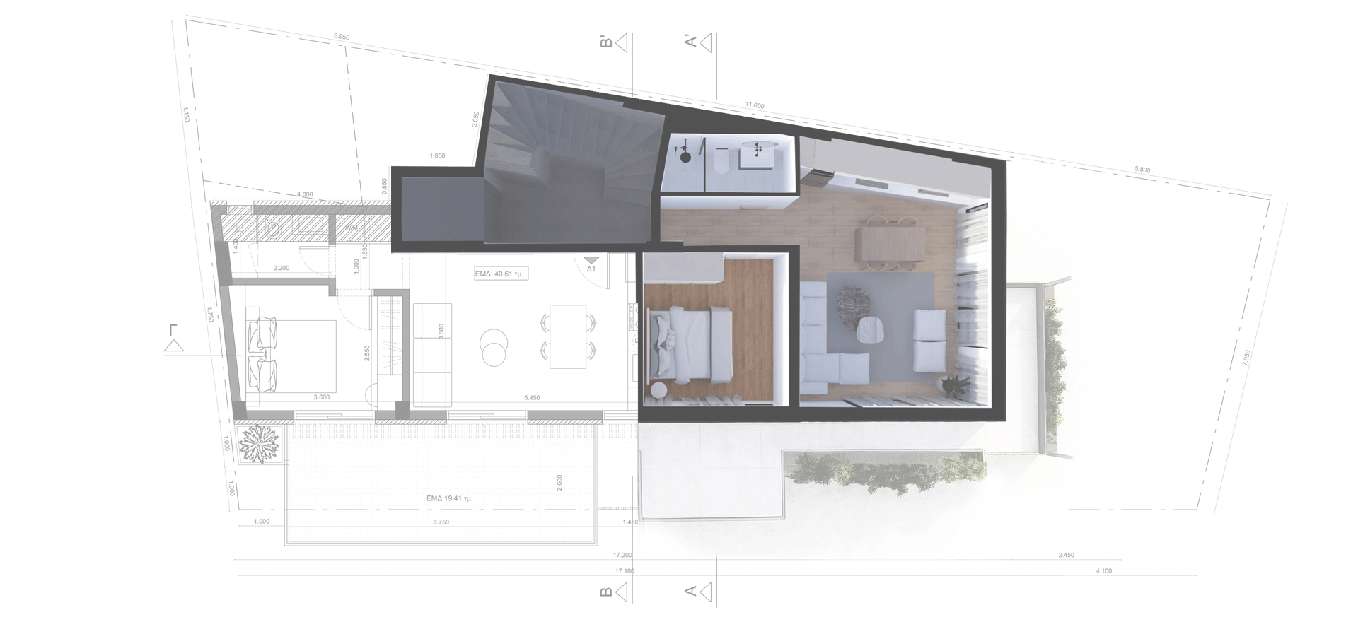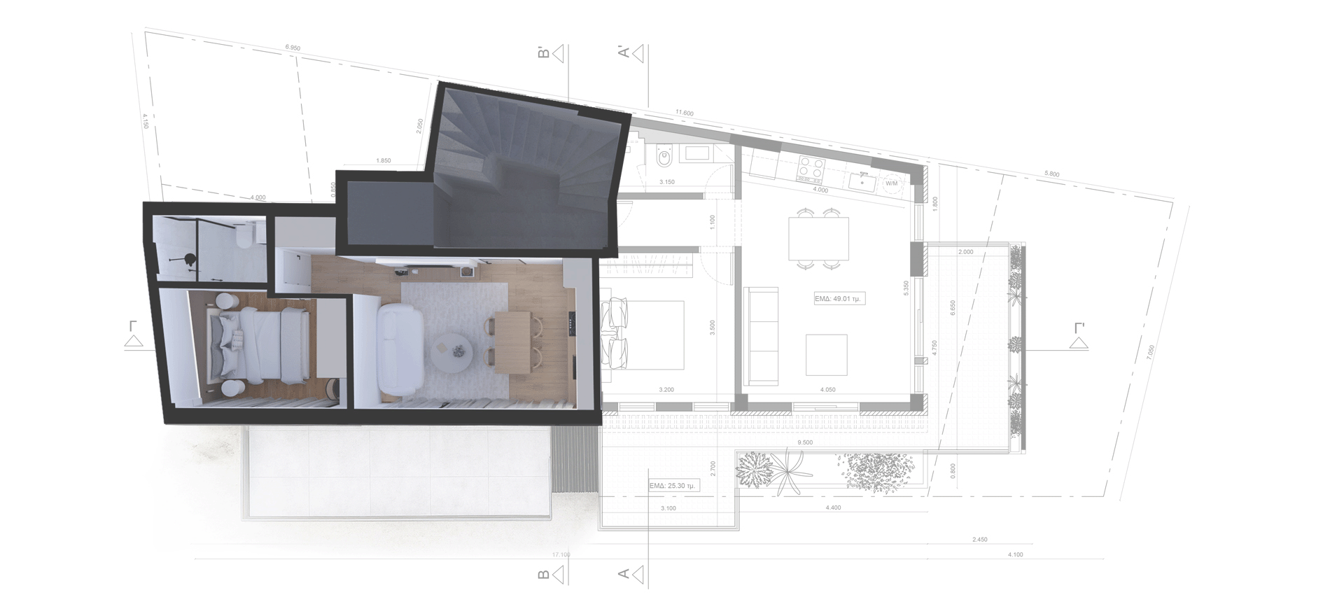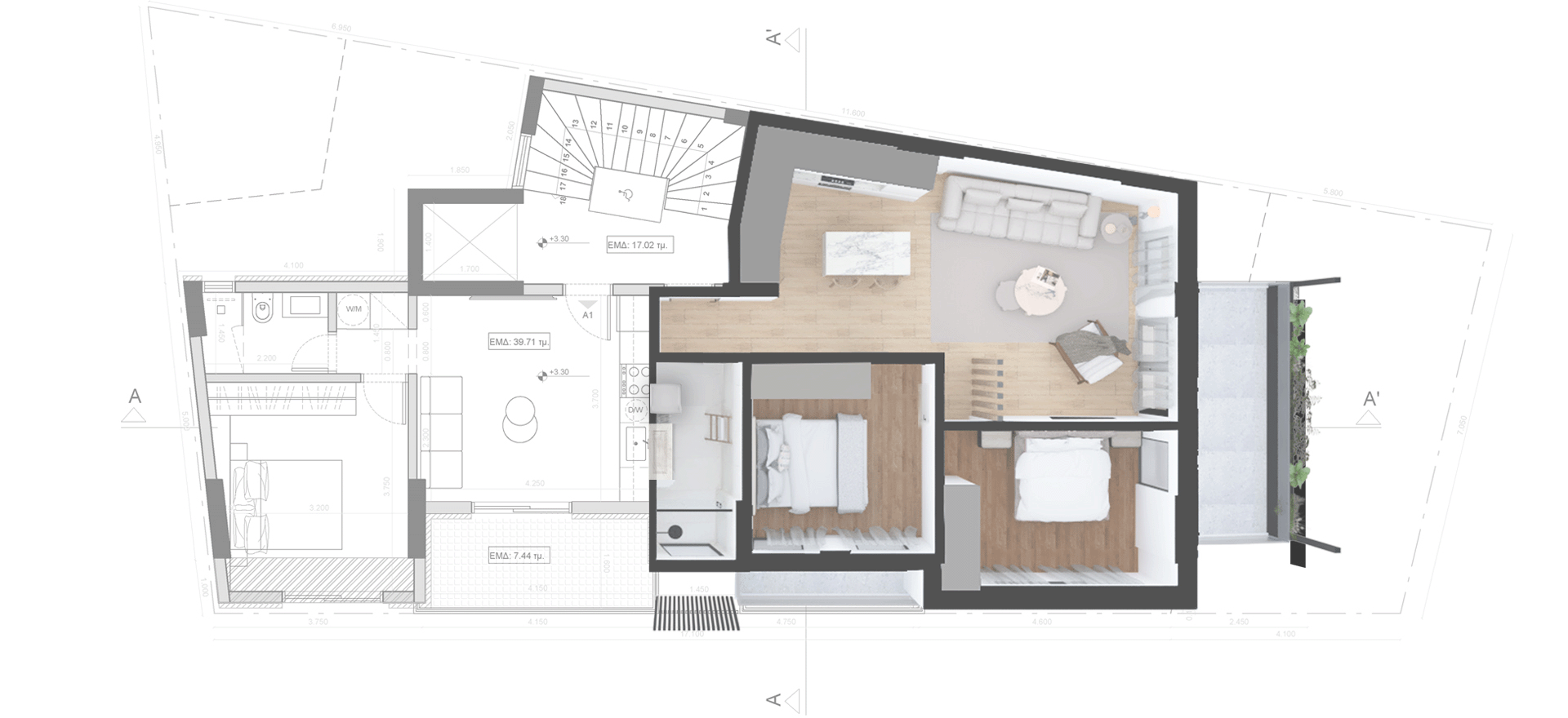 The residences feature bright, open-plan interiors with a minimal aesthetic, natural materials, and refined details that ensure comfort and high-quality living. The top floor hosts a striking duplex residence, distinguished by its highly modern design, excellent ergonomics, and enhanced sense of privacy, serving as the architectural highlight of the building.